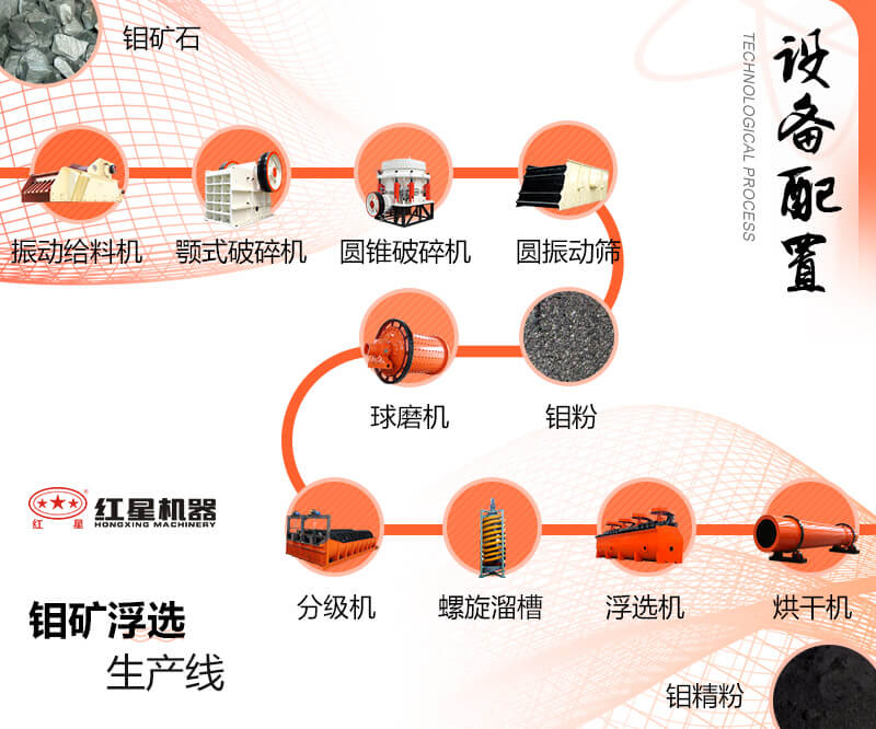 開(kai)采而來的(de)(de)(de)(de)天然鉬礦(kuang)(kuang)首先要(yao)經(jing)過鄂式破(po)碎(sui)機(ji)的(de)(de)(de)(de)粗(cu)碎(sui),進(jin)(jin)行(xing)初步的(de)(de)(de)(de)破(po)碎(sui),隨后(hou)將(jiang)(jiang)(jiang)符(fu)合粒(li)度要(yao)求的(de)(de)(de)(de)鉬礦(kuang)(kuang)物(wu)料(liao)(liao)經(jing)圓錐(zhui)破(po)碎(sui)機(ji)進(jin)(jin)行(xing)再次的(de)(de)(de)(de)細碎(sui),合格的(de)(de)(de)(de)物(wu)料(liao)(liao)經(jing)提升(sheng)機(ji)送(song)至料(liao)(liao)倉等待研(yan)磨(mo)。由(you)給料(liao)(liao)裝(zhuang)置將(jiang)(jiang)(jiang)物(wu)料(liao)(liao)送(song)入(ru)球磨(mo)機(ji)進(jin)(jin)行(xing)研(yan)磨(mo),隨后(hou)將(jiang)(jiang)(jiang)研(yan)磨(mo)后(hou)的(de)(de)(de)(de)鉬礦(kuang)(kuang)細料(liao)(liao)送(song)入(ru)螺旋分級機(ji)進(jin)(jin)行(xing)洗凈和分級,隨后(hou)經(jing)由(you)攪(jiao)拌桶送(song)至浮選(xuan)機(ji)進(jin)(jin)行(xing)浮選(xuan)作業(ye)(ye),浮選(xuan)作業(ye)(ye)主要(yao)將(jiang)(jiang)(jiang)所需礦(kuang)(kuang)物(wu)與其他礦(kuang)(kuang)物(wu)分離開(kai),最后(hou)通過高產濃縮(suo)機(ji)將(jiang)(jiang)(jiang)礦(kuang)(kuang)物(wu)中的(de)(de)(de)(de)水分去除,就得到了(le)生(sheng)產所需的(de)(de)(de)(de)鉬礦(kuang)(kuang)原料(liao)(liao)。