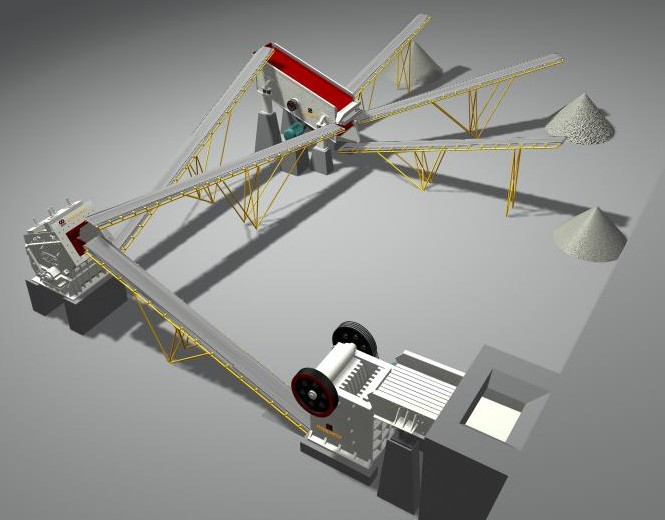 石子破碎生產線的生產流程大致為:(料倉)->振(zhen)動給料機->鄂式破碎機->反擊式破碎機->振(zhen)動篩->(成品石料),各設備(bei)中間以溜槽或皮帶輸送機相連。