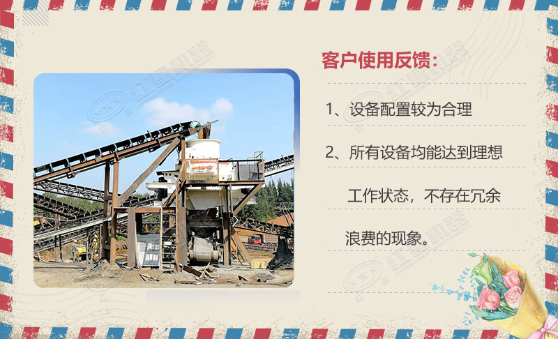 配置設備:顎式破碎機(ji)、圓錐破碎機(ji)、制沙機(ji)、振動(dong)給料機(ji)、圓振動(dong)篩(shai)和膠(jiao)帶傳(chuan)輸機(ji)等設(she)備